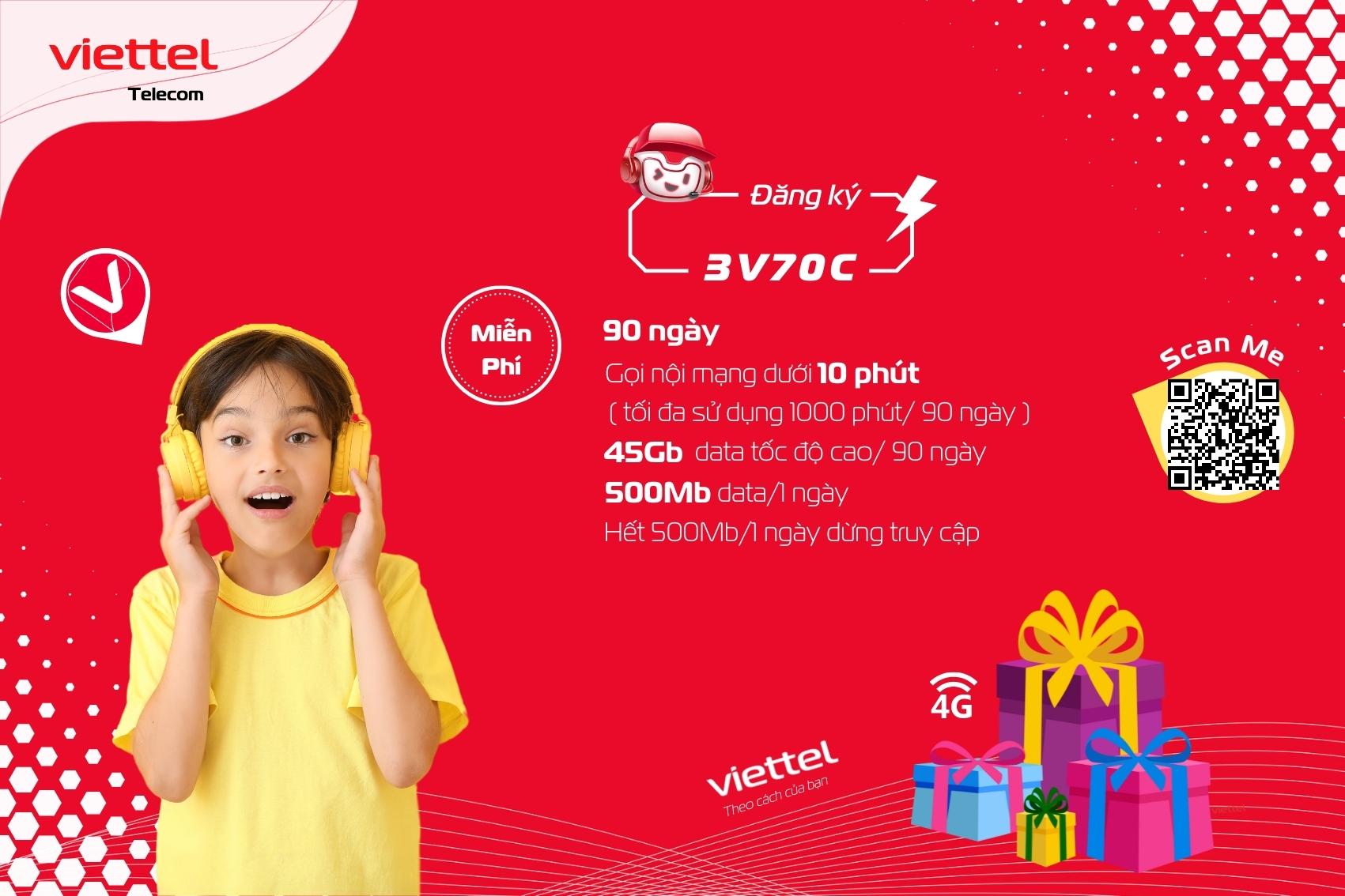 Khi đăng ký gói 3V70C của Viettel, bạn sẽ nhận ngay 45Gb data tốc độ cao đồng thời thuê bao của bạn sẽ được miễn phí toàn bộ các cuộc gọi nội mạng viettel có thời lượng cuộc gọi dưới 10 phút. Gói cước có mức phí là 210,000đ và có thời gian sử dụng là 3 tháng. Cụ thể, sau khi đăng ký gói combo gọi và data của Viettel nói trên, mỗi tháng bạn sẽ nhận được 15Gb data tốc độ cao (500Mb/ ngày) và được miễn phí các cuộc gọi nội mạng dưới 10 phút với tổng thời lượng tối đa 1000 phút và liên tục trong 3 tháng.