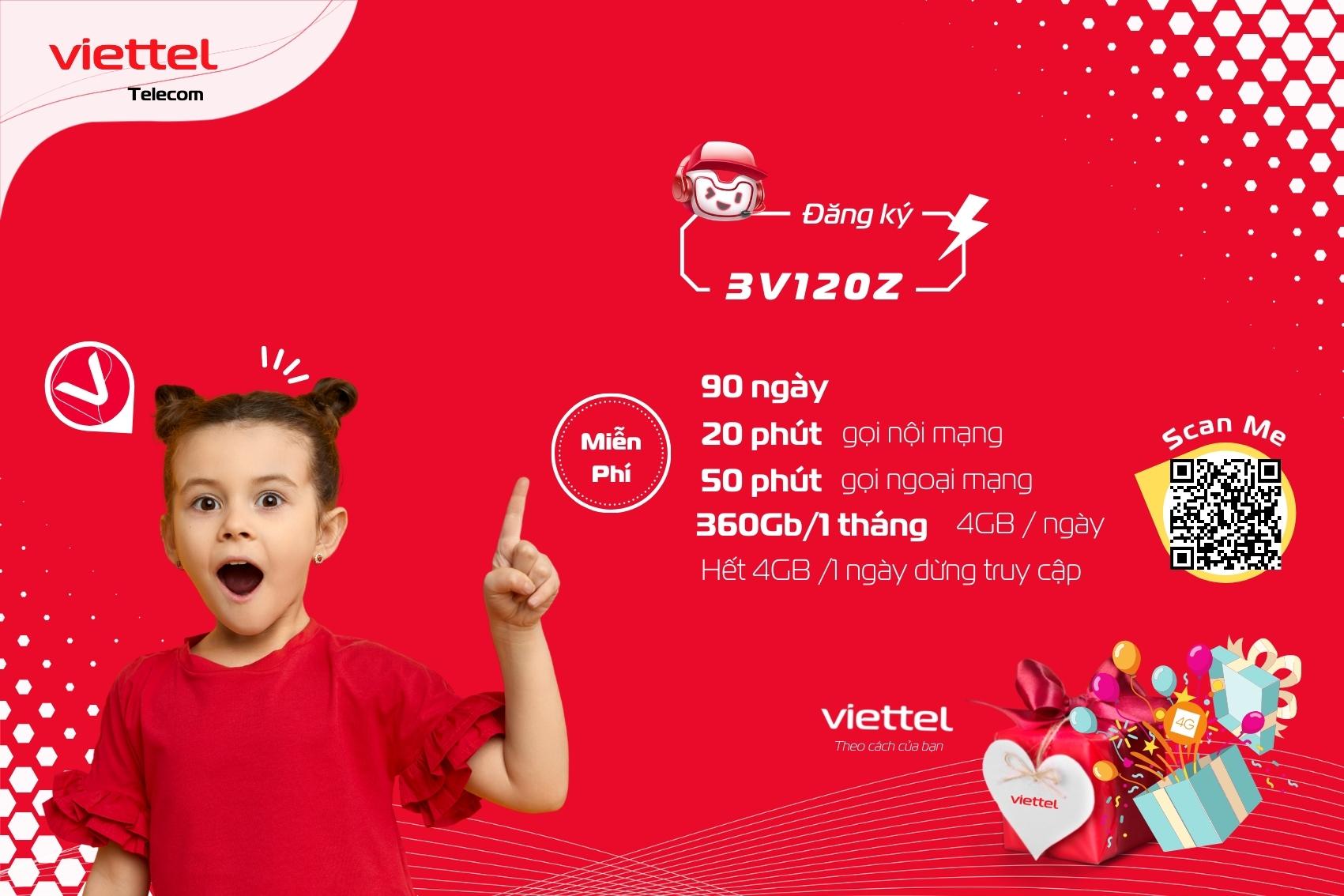 Đăng ký 3V120Z của Viettel chỉ với mức giá là 270.000đ cho 90 ngày sử dụng. Bạn nhận ngay ưu đãi là 360Gb data 4G tốc độ cao truy cập mạng internet trên điện thoại di động. Mỗi ngày có 4Gb data tốc độ cao, hết 4Gb data/1 ngày dừng truy cập ngày hôm sau sử dụng tiếp 4Gb. Ngoài ra bạn được gọi miễn phí tất cả các cuộc gọi nội mạng Viettel có thời lượng dưới 20 phút và 50 phút gọi ngoại mạng đến các nhà mạng khác tại Việt Nam.