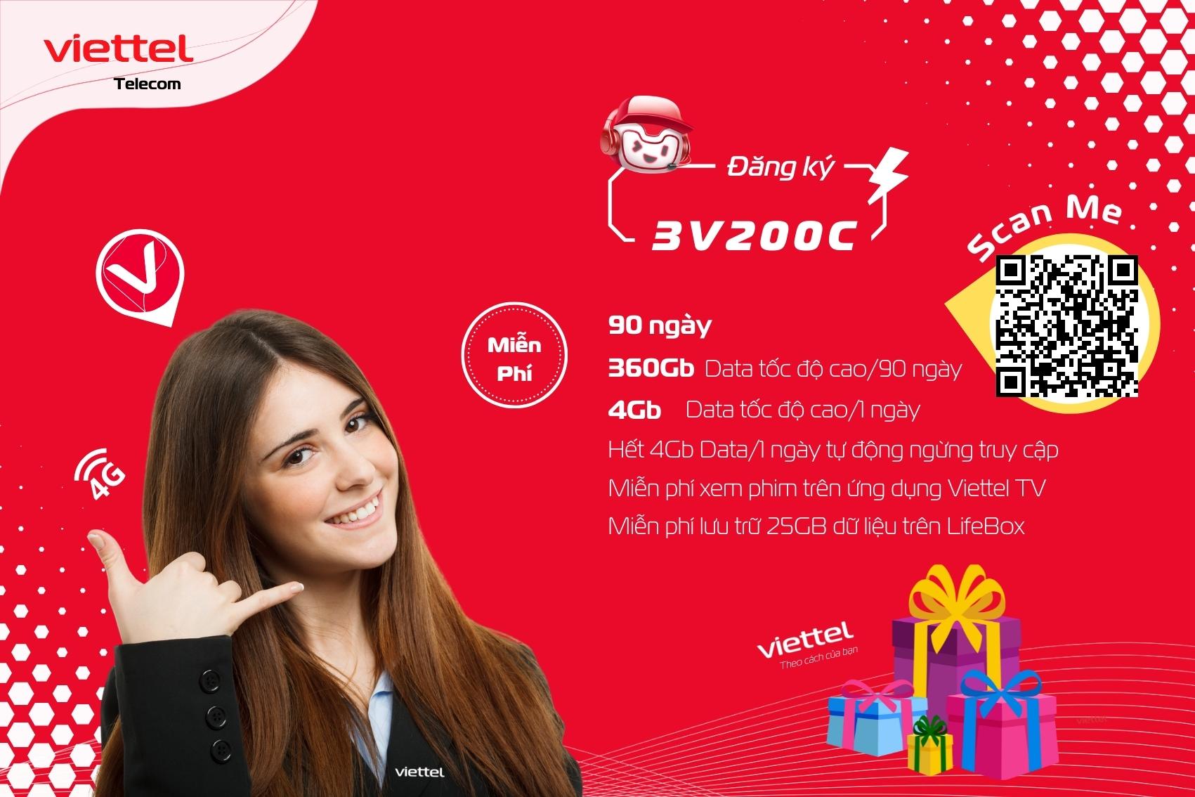 Đăng ký gói 3V200C của Viettel chỉ với 600.000đ cho 90 ngày sử dụng. Bạn nhận ngay 360Gb data 4g tốc độ cao truy cập mạng internet trên điện thoại di động. Mỗi ngày có 4Gb data tốc độ cao để sử dụng, hết 4Gb dừng truy cập mạng. Ngoài ra bạn được miễn phí gọi tất cả các cuộc nội mạng có thời lượng dưới 20 phút ( không quá 1000 phút trong tháng). Miễn phí 300 phút gọi ngoại mạng Viettel. Điều đặc biệt ở gói cước 3V200C này của Viettel bạn được, Miễn phí lưu trữ 25GB dữ liệu trên LifeBox, Miễn phí data xem phim trên ứng dụng Viettel TV trên điện thoại di động. Đây quả là một mức ưu đãi Vô cùng lớn dành cho các bạn thường xuyên truy cập internet trên di động và gọi nội và ngoại mạng Viettel.