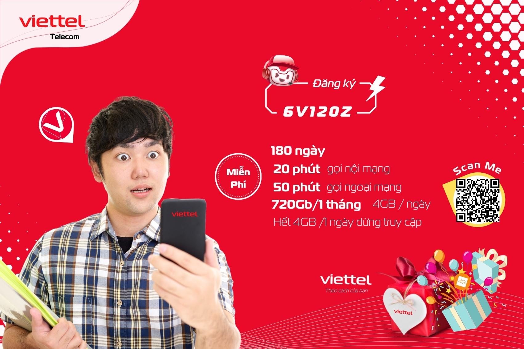 Đăng ký 6V120Z của Viettel chỉ với mức giá là 540.000đ cho 180 ngày sử dụng. Bạn nhận ngay ưu đãi là 720Gb data 4G tốc độ cao truy cập mạng internet trên điện thoại di động. Mỗi ngày có 4Gb data tốc độ cao, hết 4Gb data/1 ngày dừng truy cập ngày hôm sau sử dụng tiếp 4Gb. Ngoài ra bạn được gọi miễn phí tất cả các cuộc gọi nội mạng Viettel có thời lượng dưới 20 phút và 50 phút gọi ngoại mạng đến các nhà mạng khác tại Việt Nam.