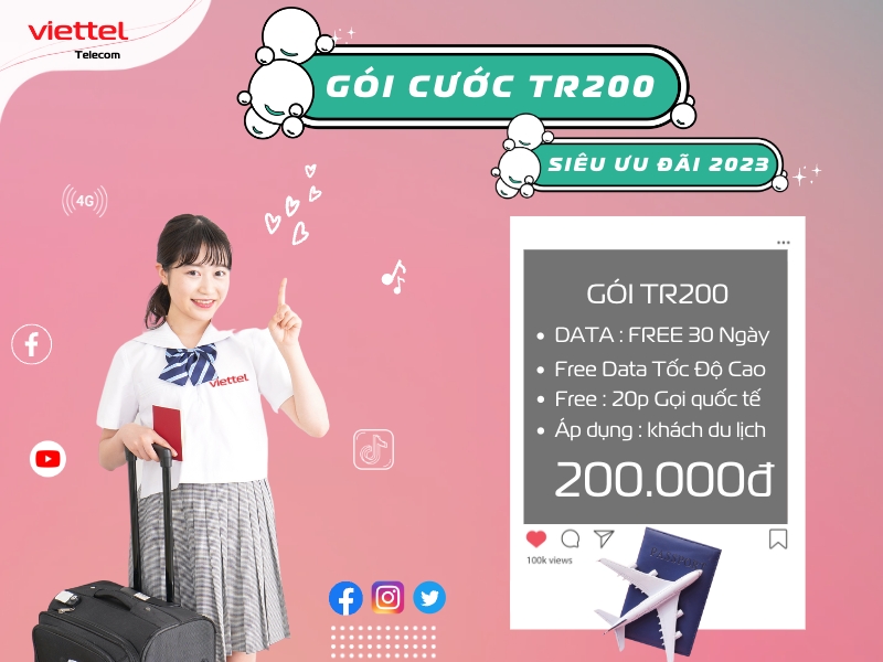 Hiểu được nhu cầu của các bạn, với sứ mệnh tiên phong chủ lực kiến tạo xã hội số, hệ thống Viettel luôn nỗ lực không ngừng để có thể mang đến cho khách hàng những sản phẩm và dịch vụ tốt nhất, góp phần xây dựng hạ tầng internet băng thông Việt Nam ngày một lớn mạnh. Bên cạnh đó hệ thống nhà mạng Viettel cũng luôn luôn đồng hành và phát triển cùng với các khách hàng đặc biệt là khách hàng sử dụng internet tốc độ cao, nội dung dưới đây chúng tôi xin tổng hợp gói TR200 của hệ thống nhà mạng Viettel được khách hàng đi du lịch đăng ký sử dụng, để các bạn tiện theo dõi và đăng ký sử dụng khi thấy phù hợp với của mình. Mời các bạn tham khảo thông tin chi tiết gói TR200 của Viettel dành cho khách hàng đi du lịch dưới đây nhé.